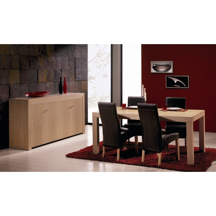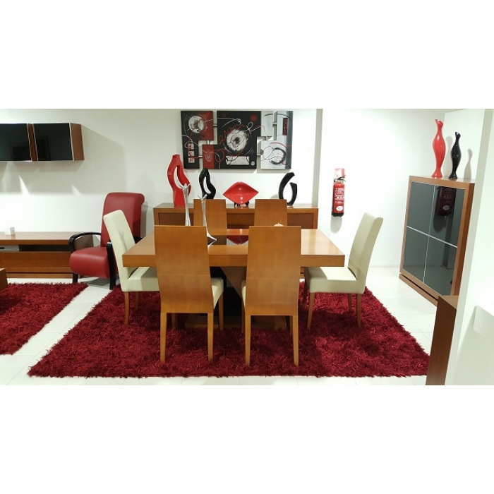 Sala de Jantar Cerejeira Sala composta por: Aparador em Cerejeira com 200 x 90 x 50. Móvel Bar em Cerejeira com 120 x 127,5 x 40. Mesa com vidro extensível em Cerejeira com 169 x 77 x 99,5. Cadeira S017 em Sintético Rena. Cadeira costa madeira em Cerejeira. Ver detalhes