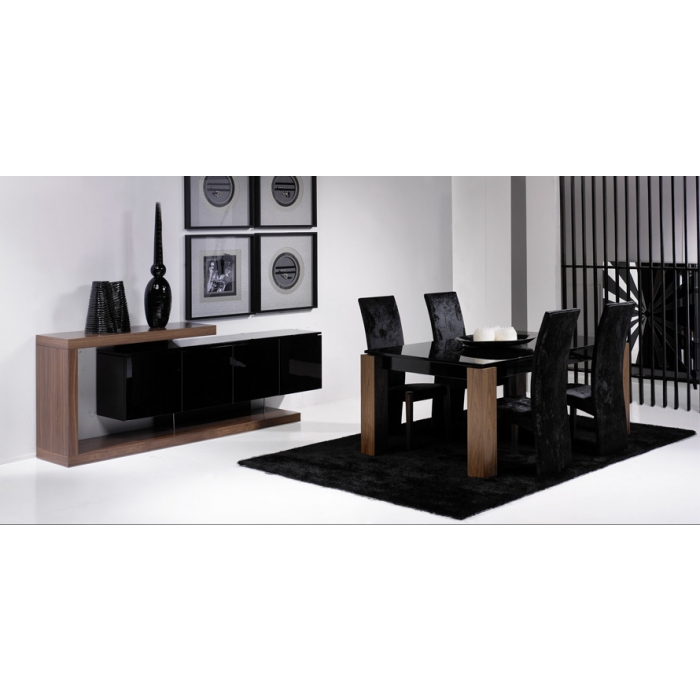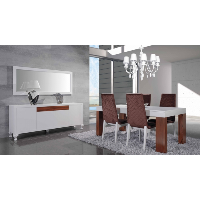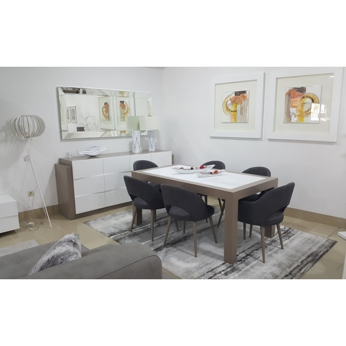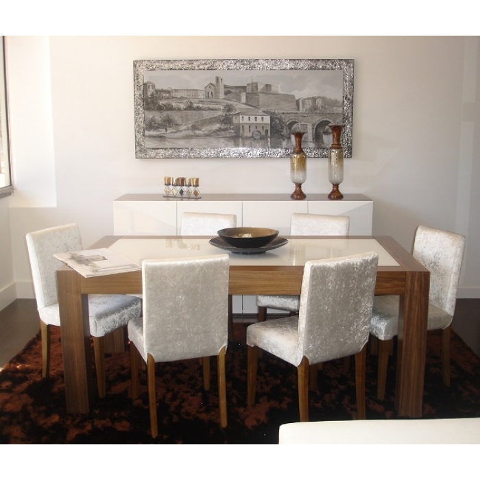 Sala de Jantar MR com Nogueira Aparador em Lacado Alto Brilho Branco + Nogueira com 200 x 90 x 50. Mesa de jantar em Nogueira + Vidro extra claro creme com 179 x 75 x 100. Cadeira em Veludo com pés em Nogueira. Ver detalhes