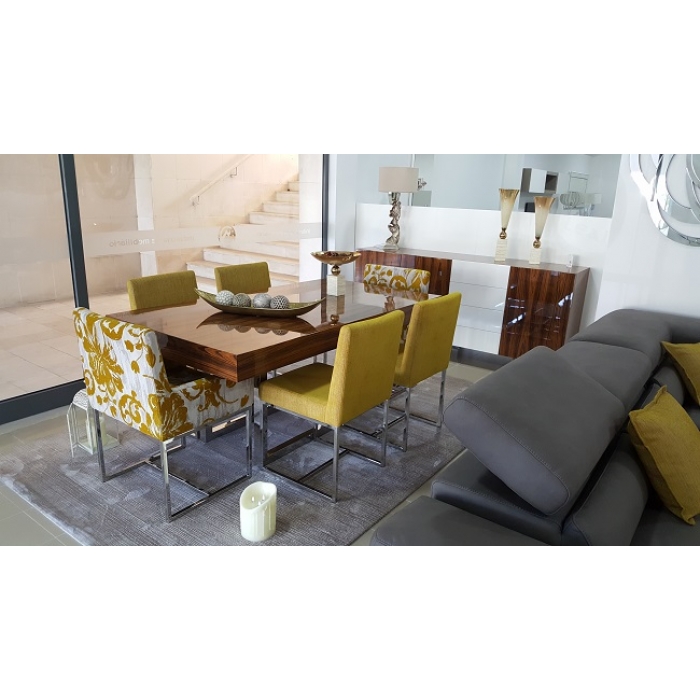 Sala de Jantar Pau Ferro em Alto Brilho Aparador em Pau Ferro Alto Brilho + Lacado Alto Brilho com pés em inox com 200 x 90 x 55. Mesa Jantar Extensível em Pau Ferro Alto Brilho + pés em inox com 180 x 100 + 50 +50. Cadeira Inox em Tecido Tippet 40514. Cadeirão Inox em Tecido Ravel 40514. Ver detalhes