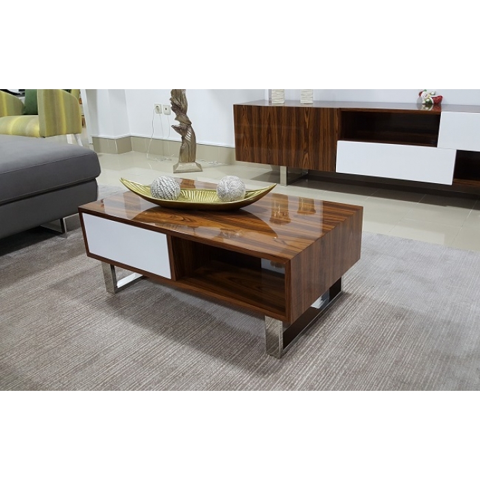 Mesa de centro Pau Ferro Alto Brilho Mesa de Centro em Pau Ferro Alto Brilho com Lacado Branco Alto Brilho, com uma gaveta com abertura de tic-tac, pés em inox. Medidas totais: 90cm x 35cm x 50cm. Ver detalhes