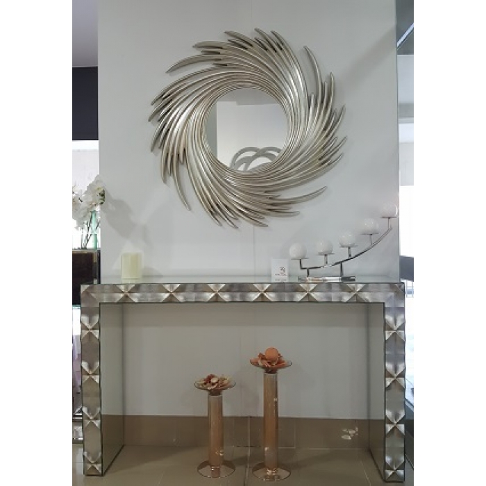 Consola Folha de Prata Consola em Folha de prata + Espelho. Medidas totais: 140cm x 86cm x 35cm. Moldura/espelho em Folha de prata. Ver detalhes